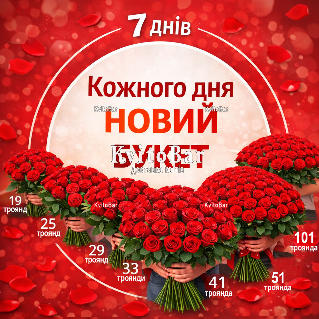 Кожного дня протягом тижня кур'єр буде привозити вашій дівчині новий букет троянд. З кожним днем дівчина буде отримувати букет все більше і більше. На сьомий день кур'єр доставить дівчині букет із 101 троянди.