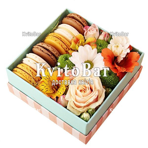 1 кремова троянда, 1 альстромерія, 1 хризантема, 6 макарун, коробка