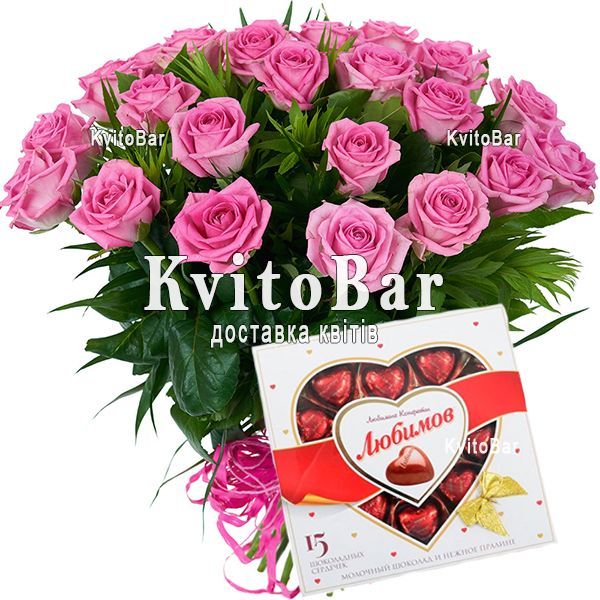 21 рожева троянда, оформлення + цукерки Любимов