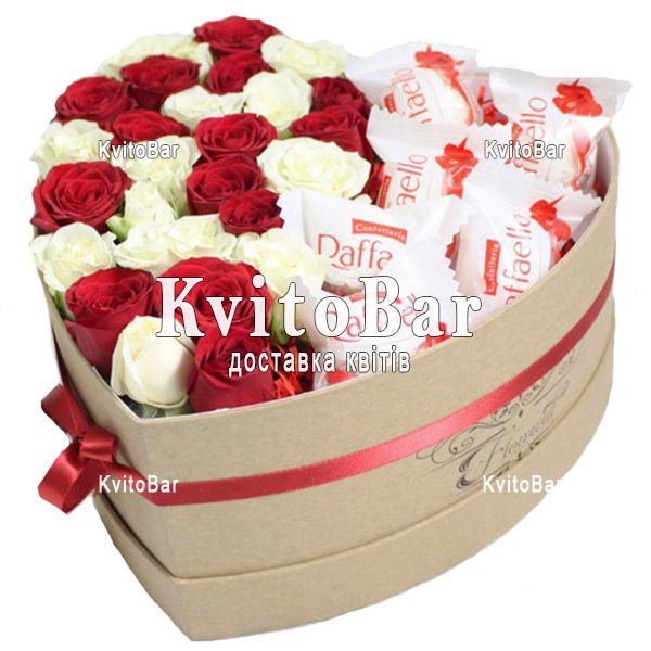 червоні троянди білі кущові троянди, 15 цукерок Raffaello, коробка