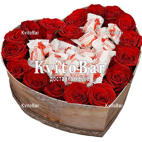 Склад:11 червоних троянд, 15 цукерок Raffaello, оформлення