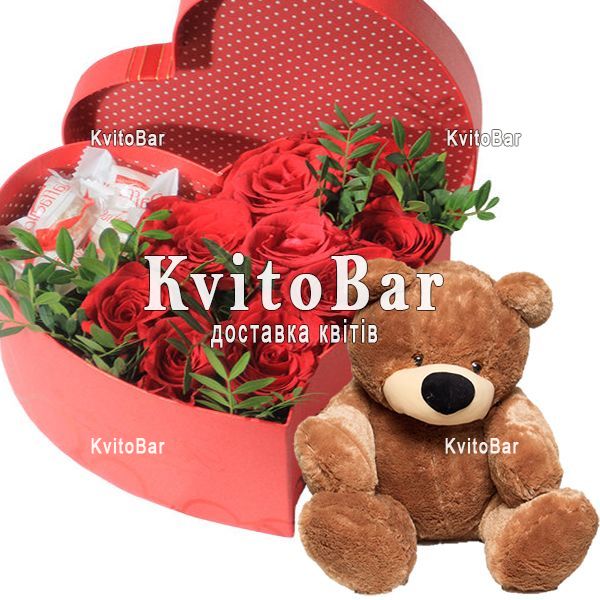 9 червоних троянд, 15 цукерок Raffaello, коробка, Ведмедик 30-40 см.