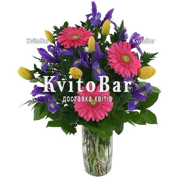 Букет із 7 ірисів, 4 гербер, 6 тюльпанів